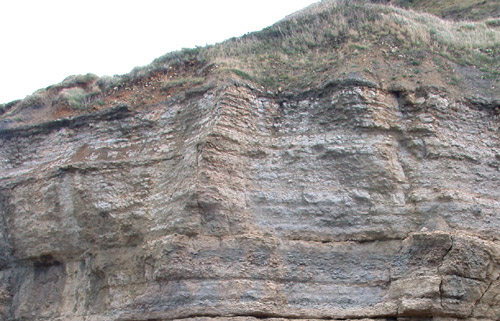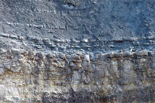 Les Couches de passage se suivent tout le long de la falaise calcaire abrupte ; elles forment la corniche qui supporte les Marnes de Port en pente plus douce. |