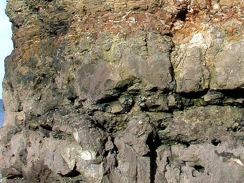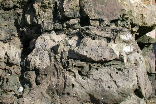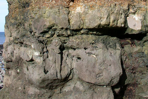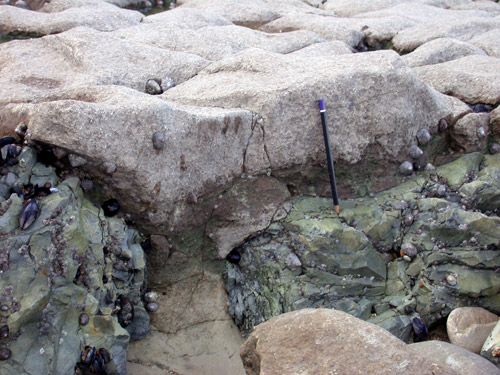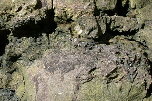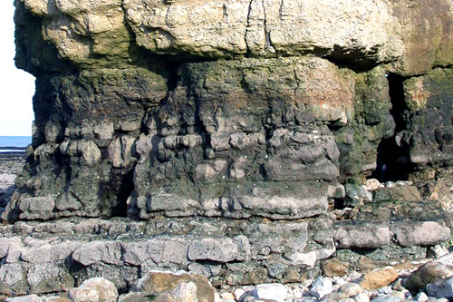 Nodules de silex verdâtres inclus dans un banc de calcaire bioclastique gris beige affleurant sur le platier rocheux