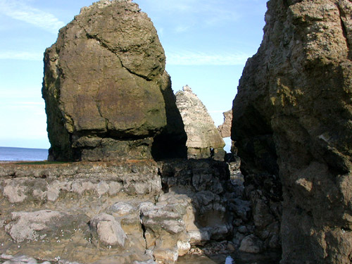 Les calcaires gris beige de la Malière bajocienne affleurent largement sur le platier rocheux découvert à marée basse ainsi que dans le soubassement des aiguilles de la falaise des Hachettes. Ils forment des bancs décimétriques aux surfaces ondulées, creusées de poches de dissolution, et contiennent de nombreux silex verdâtres ou gris noir sous forme de nodules et de lentilles tabulaires.