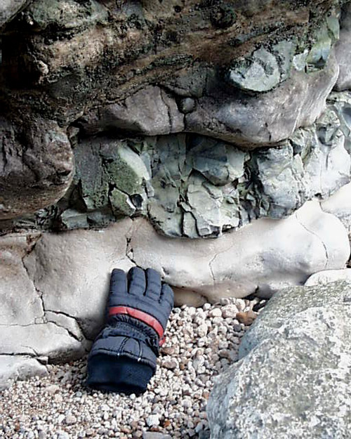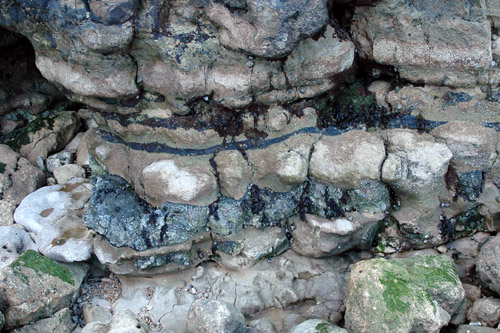 Passées siliceuses tabulaires et rognons de silex, verdâtres à gris noir, dans les calcaires gris beige de l’estran, au pied des falaises du site des Hachettes.