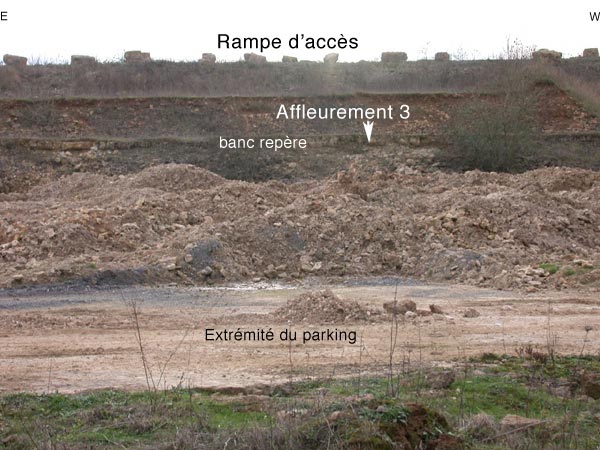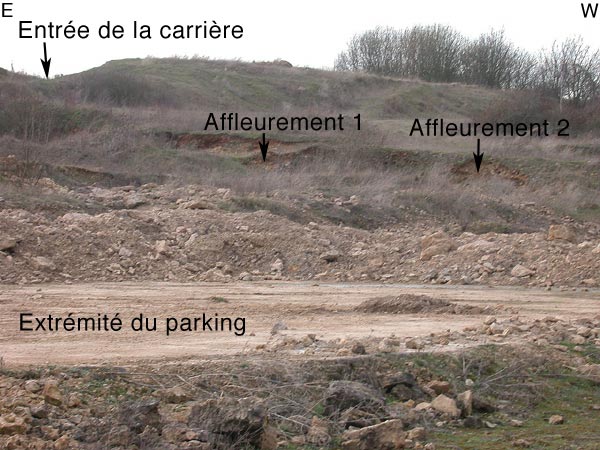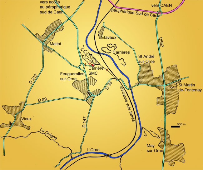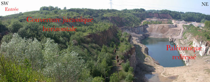 discordante. La couverture jurassique a été en grande partie décapée pour permettre l'exploitation des quartzites ordoviciens. Il ne reste actuellement qu'une partie de la couverture, s'étendant du Pliensbachien au Bajocien, dans la partie haute de la carrière. La carrière est maintenant utilisée par la SMC (Société des matériaux caennais) comme plateforme de stockage et recyclage de matériaux. Un aménagement est en projet, avec ouverture au public, pour une mise en valeur du patrimoine géologique normand et pour une utilisation pédagogique. Les affleurements décrits sont donc susceptibles de disparaître, mais d'autres, équivalents ou peut-être plus complets, seront mis à jour à la faveur des aménagements. |