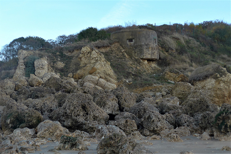 Une succession de bancs appartenant à la Formation du Calcaire oolithique de Trouville est exposée dans le panneau glissé situé en bas du versant, sous l’ancien blockhaus. Ce panneau glissé est issu de la corniche calcaire du sommet du Mont Canisy.