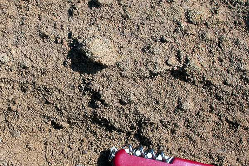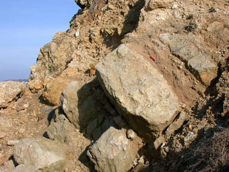 Deux bancs massifs de calcaire boueux et bioclastique gris clair encadrent un niveau de calcaire oolithique très friable présentant à son sommet un cordon de galets intraformationnels. |