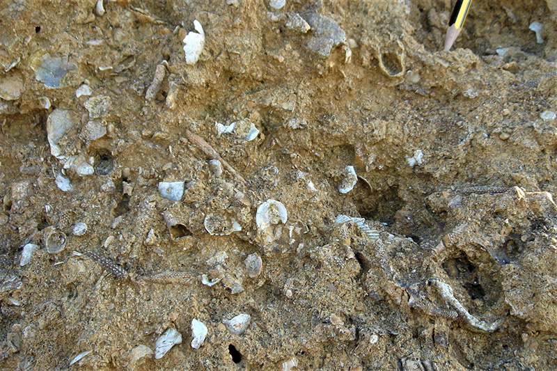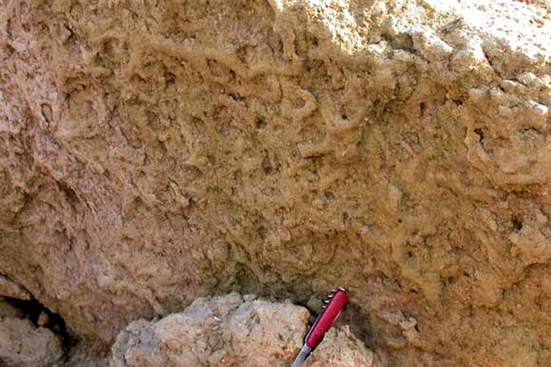 La base du banc calcaire bioclastique inférieur est bouleversée par un réseau de galeries de thalassinoïdes, témoignant d'une intense bioturbation et d'un ralentissement de la sédimentation. |