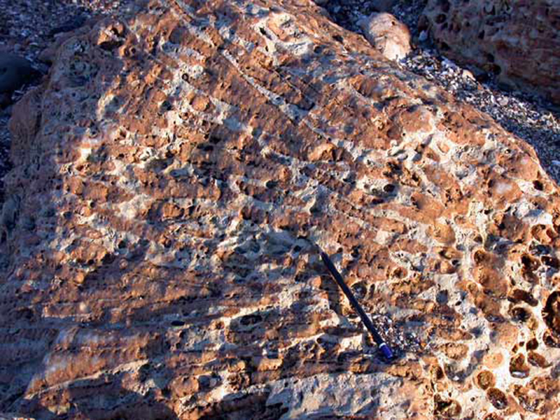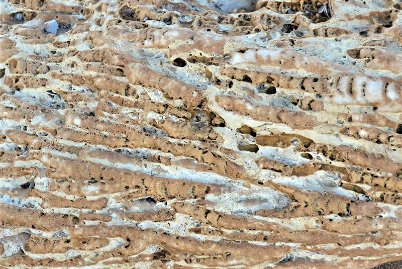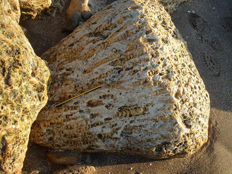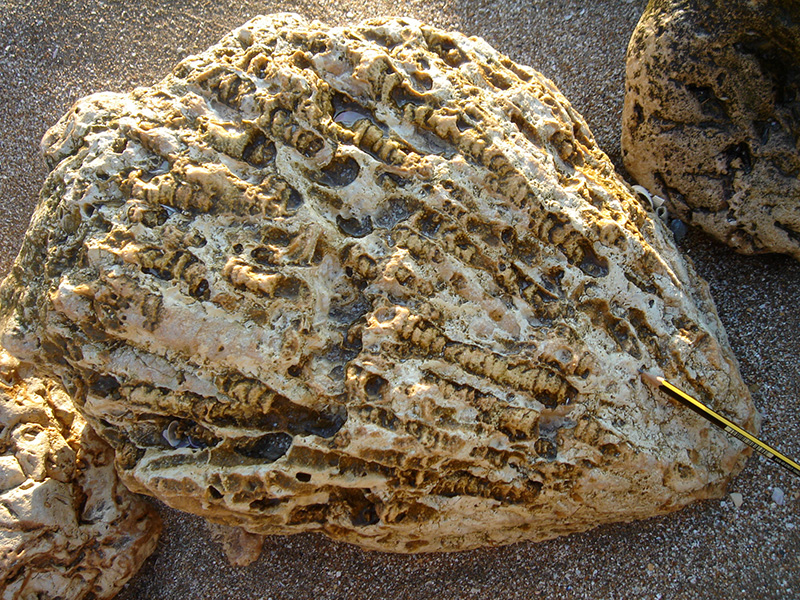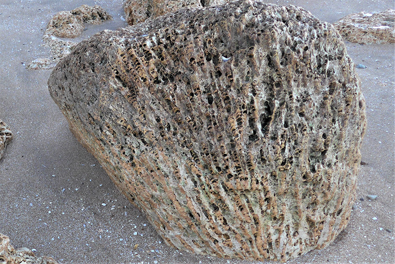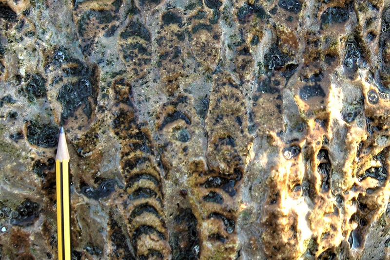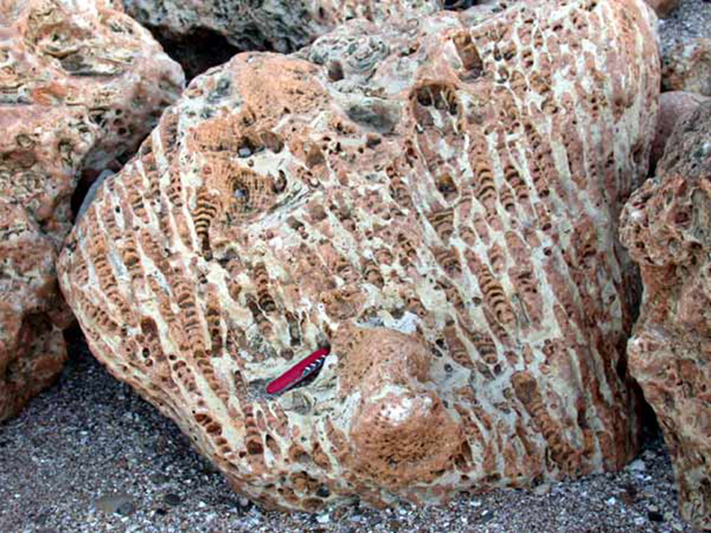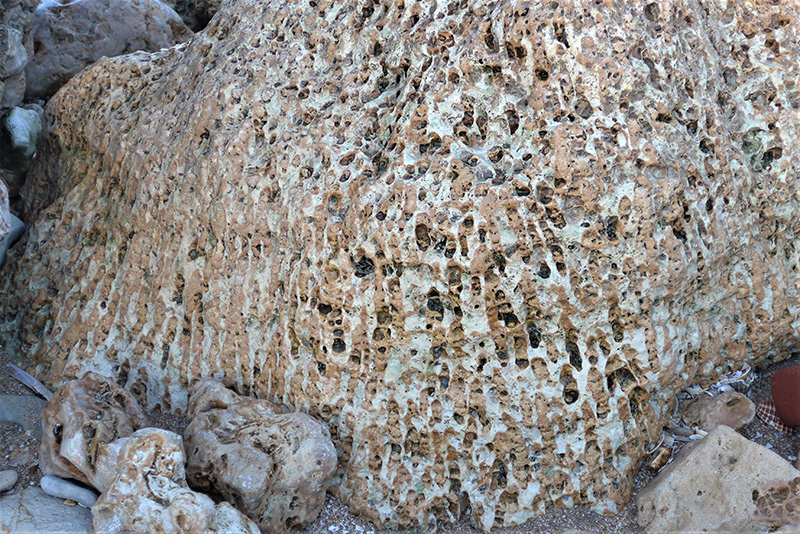 La surface irrégulière permet d'observer des colonnes squelettiques entières (à gauche) ainsi que des sections dans des plans, longitudinaaux, obliques ou transversaux (sur le replat du rocher). Certaines colonnes montrent leurs planchers convexes. |