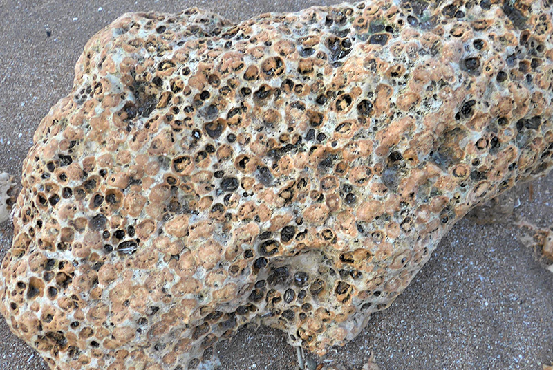 Cette gerbe de polypiers aux ramifications denses et pauvres en recristallisations offre un aspect vacuolaire fréquent dans les faciès récifaux.