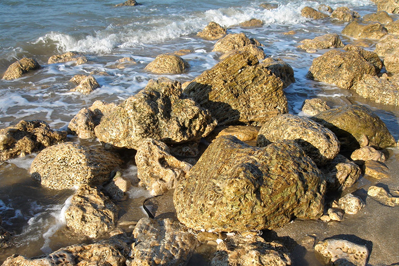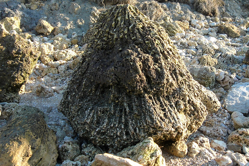 Le récif du Mont Canisy présente de nombreux fossiles d’organismes constructeurs qui peuvent être étudiés dans les blocs éboulés éparpillés sur la plage. Les blocs les plus spectaculaires sont des grosses gerbes de polypiers branchus.