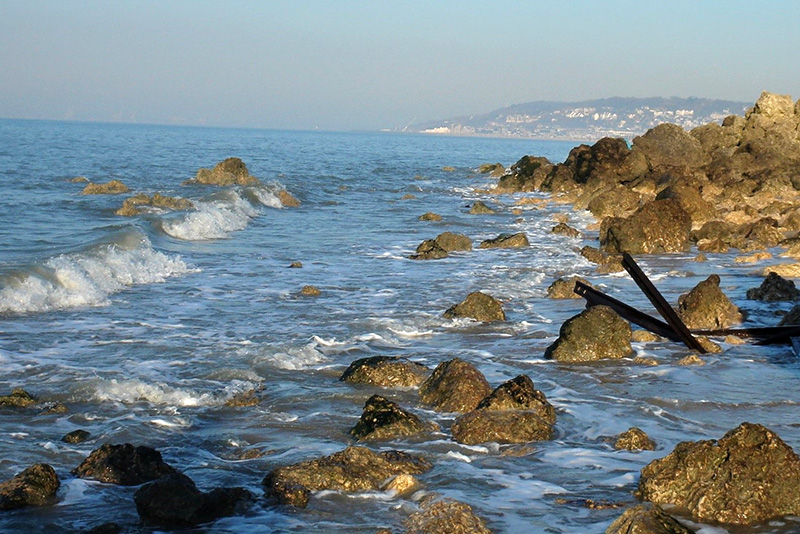 Les blocs rocheux sont recouverts par la mer à marée haute.