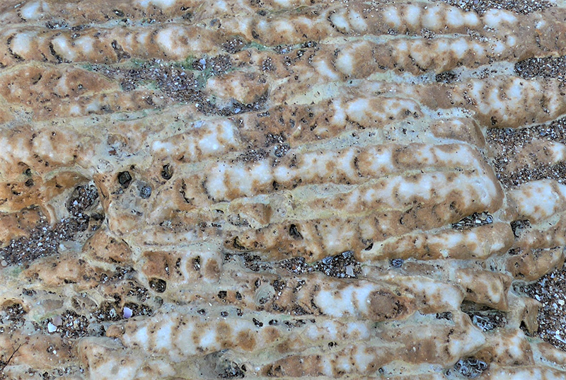 Les colonnes squelettiques de ces polypiers (couchés), vues en coupe longitudinale, ont été recristallisées en calcite ocre. L’aragonite du squelette est souvent recristallisée en calcite dont la couleur ocre est liée à la présence d’oxyde de fer.