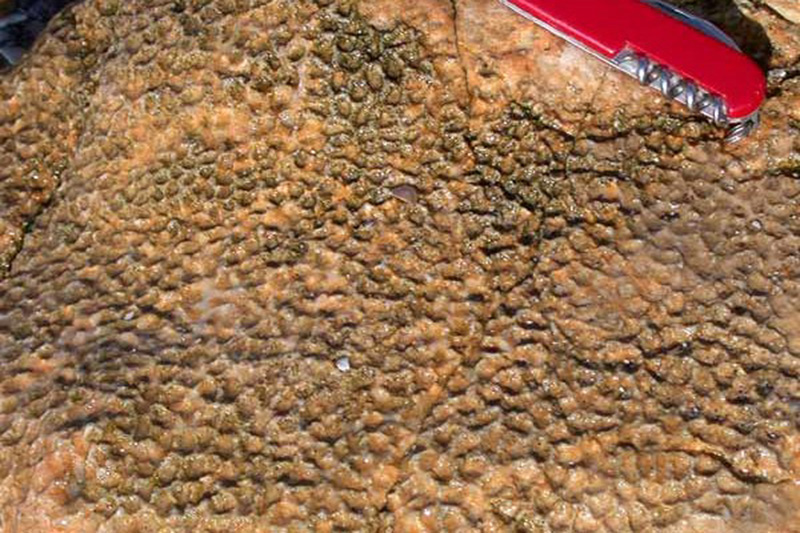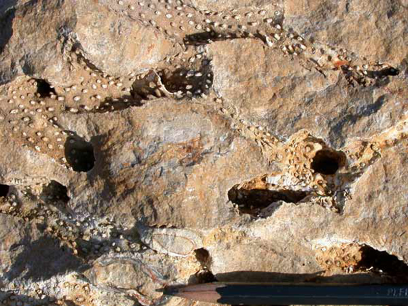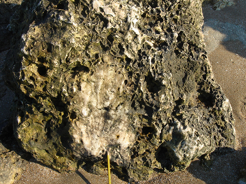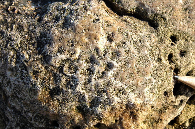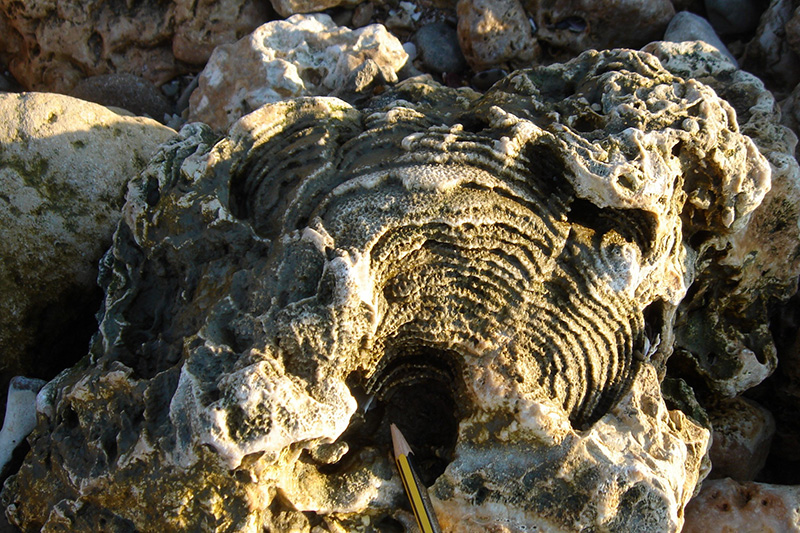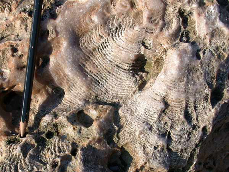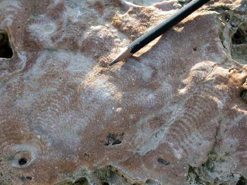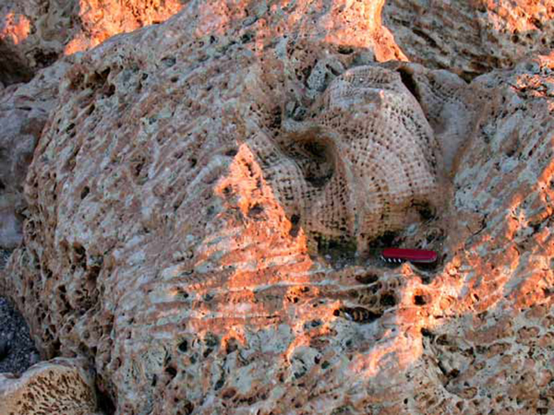 Cette colonie d'aspect quadrillé est formée par un ensemble de piliers disposés côte à côte et réunis par des plates-formes calcaires. L'érosion fait apparaitre l’organisation verticale de la structure récifale construite. |