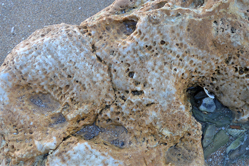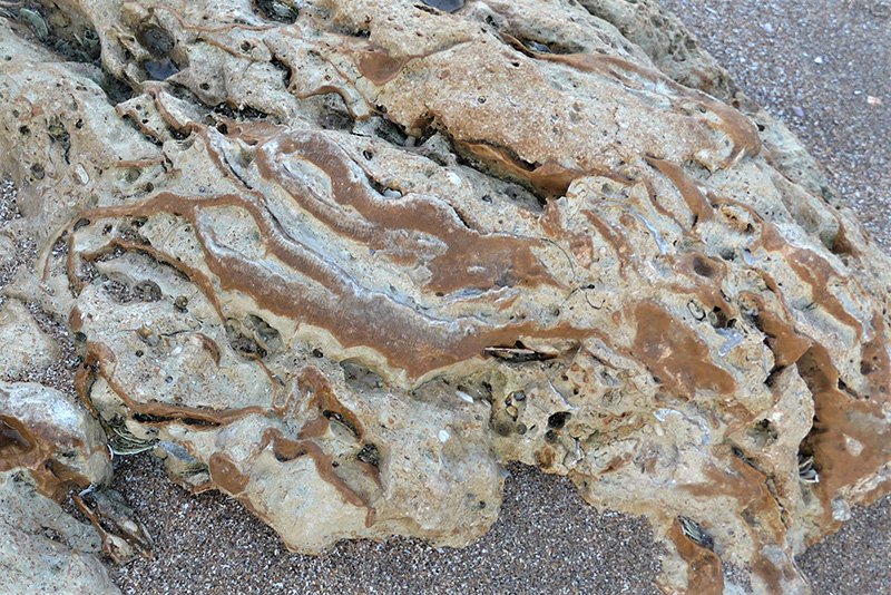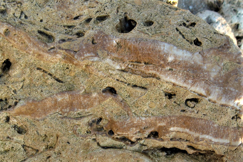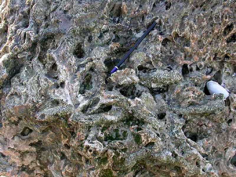 Ce calcaire corallien vacuolaire renferme des constructions de teinte ocre à structure finement quadrillée, partiellement enduites de calcite blanche. Il s’agit peut-être de stromatopores. Appartenant autrefois aux Cnidaires, ils sont maintenant rattachés aux spongiaires (sclérosponges). Leur squelette est constitué de lames calcaires traversées par des piliers verticaux. Ils sont localisés au sommet de la formation récifale, à faible profondeur.