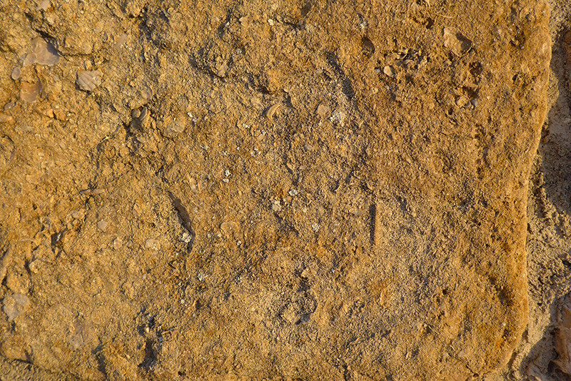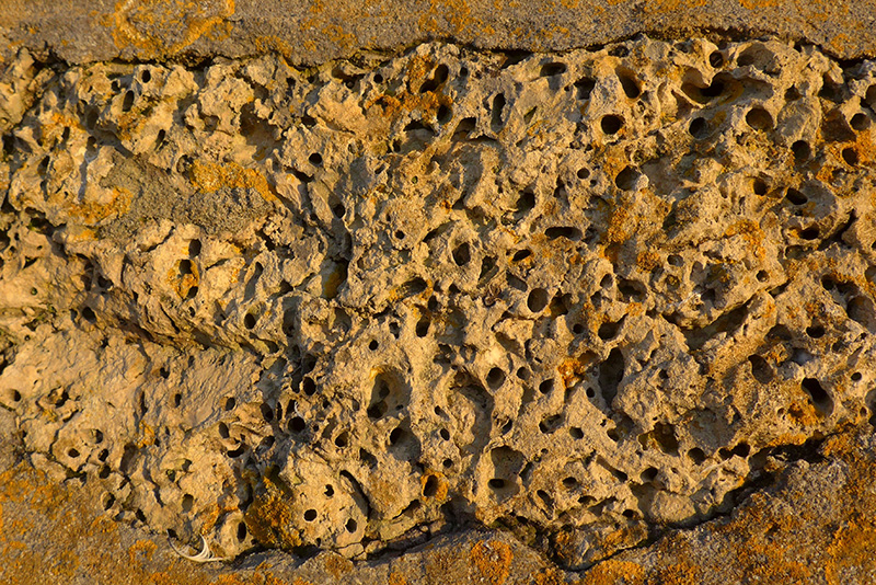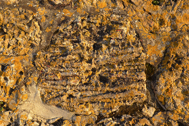 Dans ce calcaire périrécifal, de nombreuses cavités à section circulaire correspondent à l’emplacement de nérinées (gastéropodes) dont la coquille a été dissoute.
