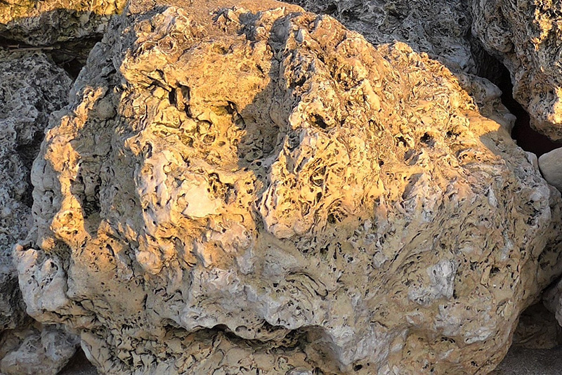 Bloc de calcaire récifal, dépourvu de stratification, d’aspect chaotique et vacuolaire |