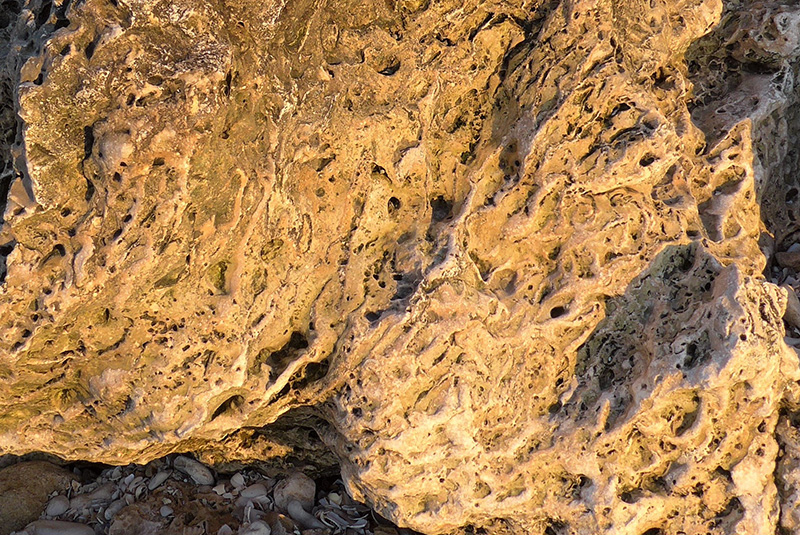 Dans ce bloc de calcaire vacuolaire, les cavités correspondent à des rameaux de polypiers dont les structures internes ont été dissoutes. |