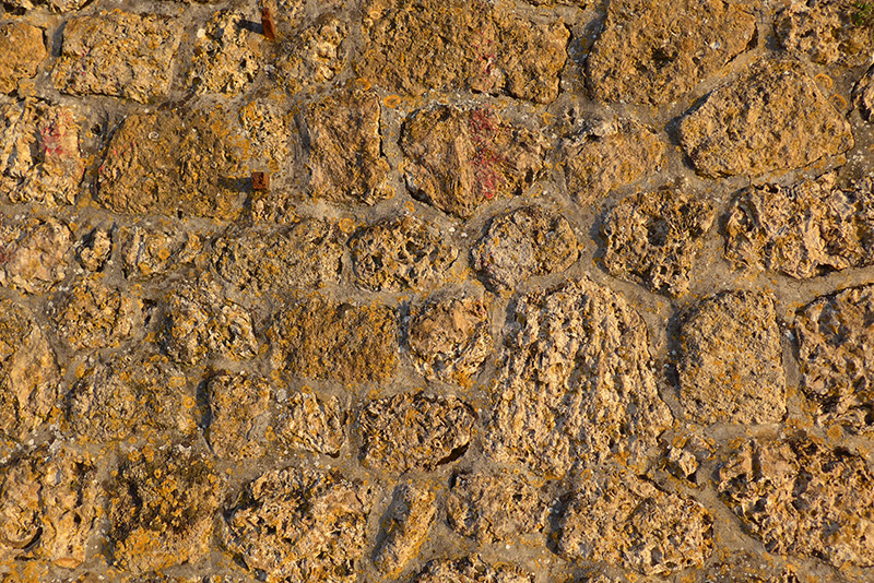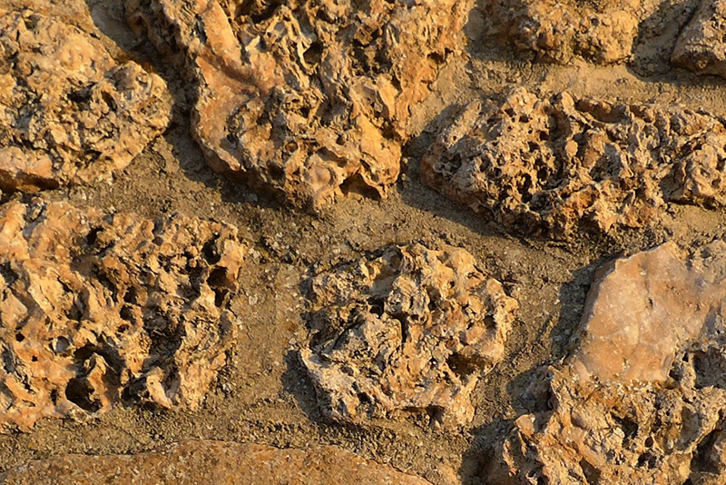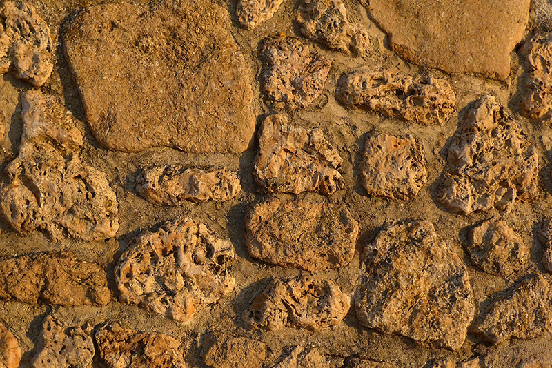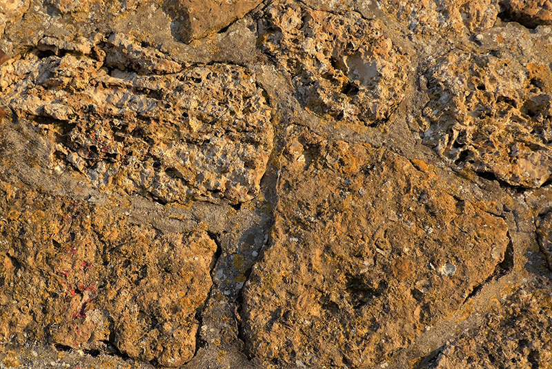 Les moellons aux surfaces planes correspondent à des calcaires bioclastiques stratifiés (faciès périrécifal). Les autres moellons, à surface très irrégulière, sont pour la plupart des calcaires récifaux vacuolaires. |