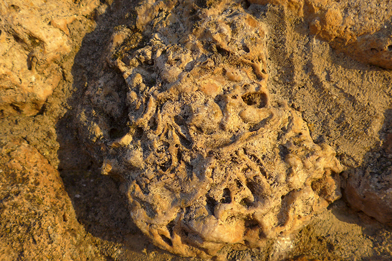 Bloc de calcaire récifal, présentant un entrelacs de constructions calcaires (non identifiées). |