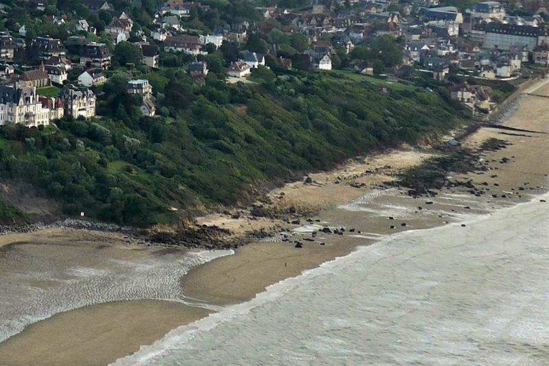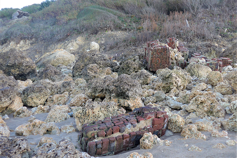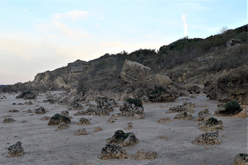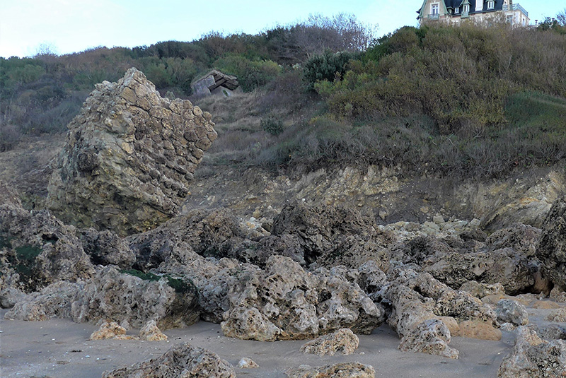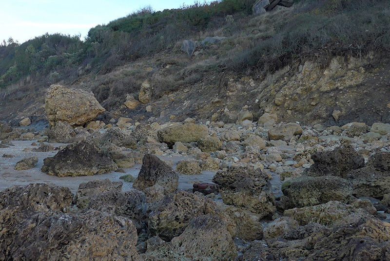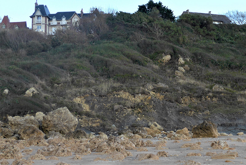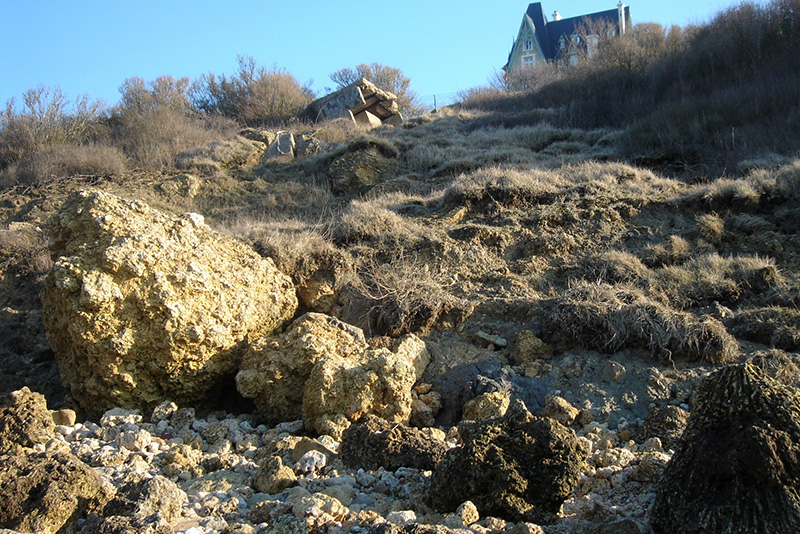 Un ouvrage de maçonnerie a glissé jusqu’à la plage.Il a rejoint les nombreux blocs de calcaire récifal issus de l’écroulement de la corniche du Mont Canisy. Un panneau de calcaire est encore enchâssé dans les marnes glissées à la base du versant. En arrière-plan, l’ancien blockhaus, en partie disloqué, a amorcé sa descente vers la plage. |