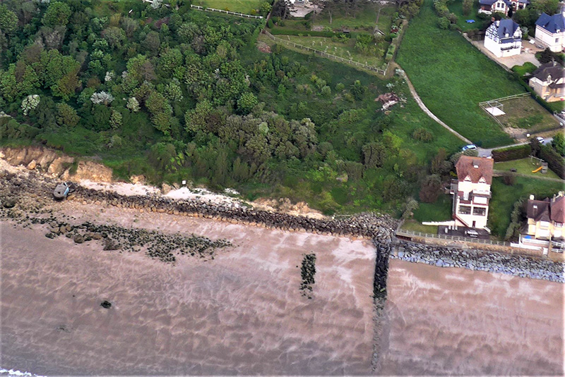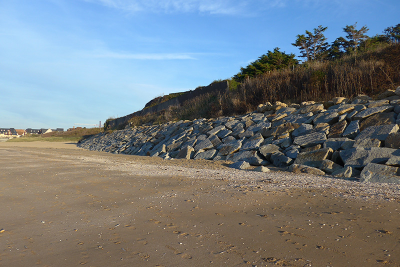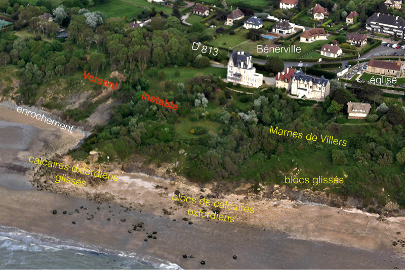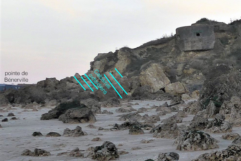Un enrochement protège les constructions de la cité balnéaire ; il se prolonge au pied du versant vers l’Est (à gauche sur la photo) jusqu’à un blockhaus écroulé, situé devant un pan de calcaires oxfordiens glissé.