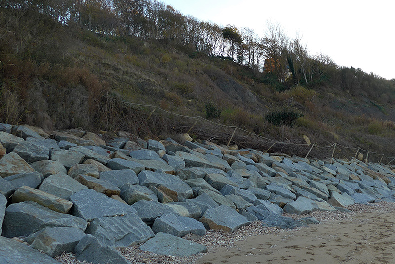 L’enrochement est destiné à contenir les coulées de boue issues des Marnes de Villers qui constituent la base du versant. Il limite le déblaiement des argiles par la mer. Le fluage des argiles est souligné par l’inclinaison des poteaux de clôture.
