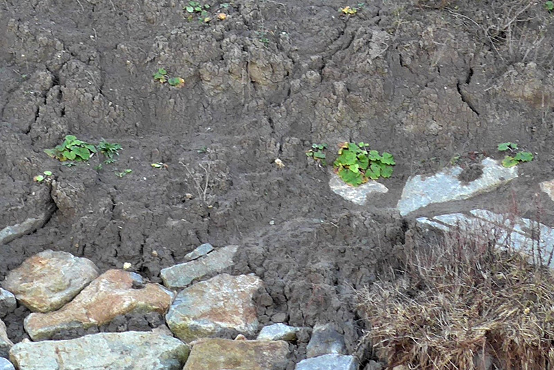 Les gerbes de polypiers côtoient des pans de mur en briques, glissés, provenant de la zone construite en bordure de la route D 813 au sommet du versant, .