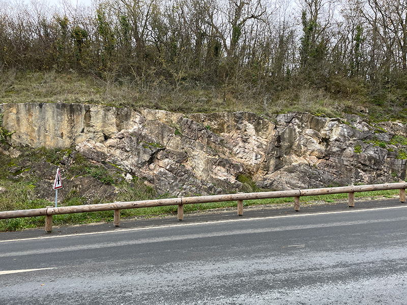 Les calcaires magnésiens affleurent sur une vingtaine de mètres dans l’escarpement rocheux. Les bancs calcaires, orientés N115, plongent de 30° vers le Nord.