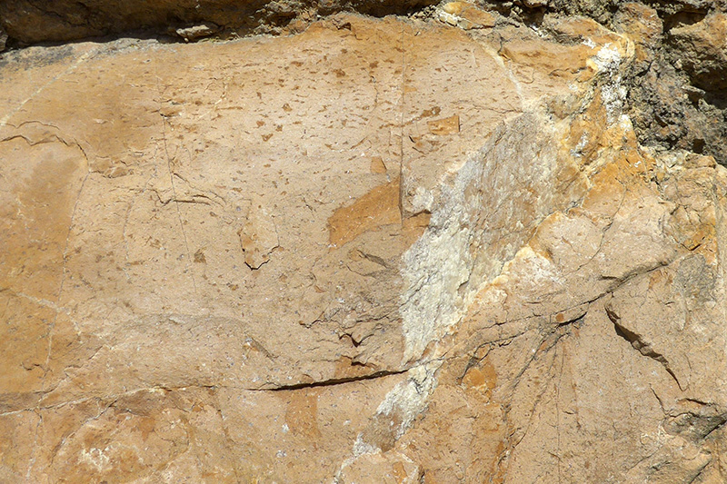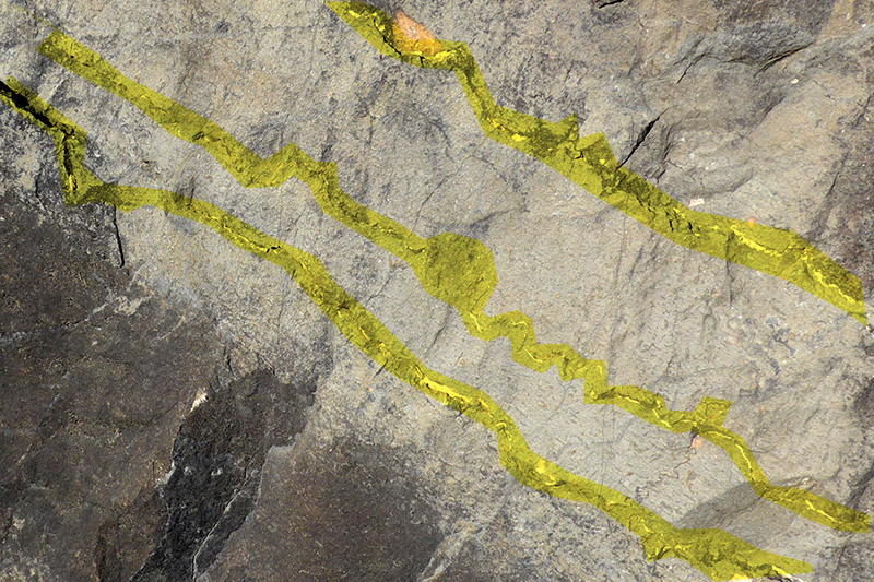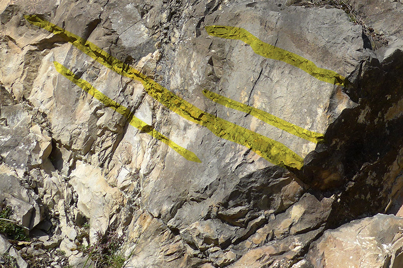 Les bancs de calcaires magnésiens sont fracturés et parcourus de joints stylolithiques (surlignés en jaune).