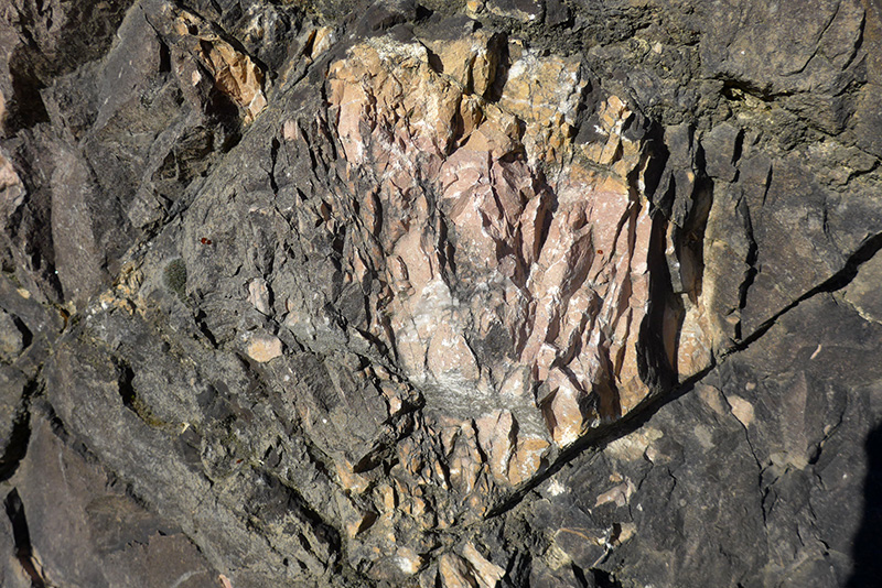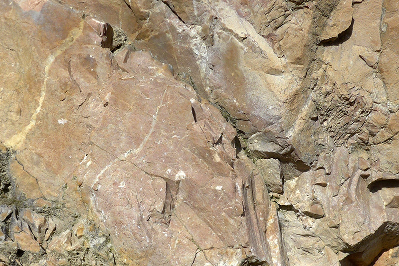 Les calcaires magnésiens sont des calcaires compacts à grain très fin et à cassure franche. La couleur rose est liée à la présence d’un oxyde de fer (Fe2O3), l’hématite. Des filonnets de calcite blanche contribuent à donner à la roche un aspect de marbre. |