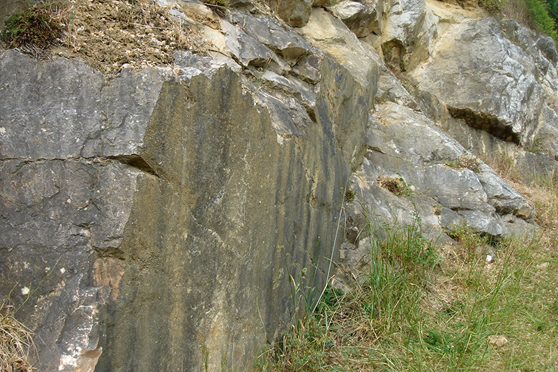 Cette surface verticale qui tronque les bancs de calcaire magnésien est un miroir de faille. Elle présente des stries de frottement horizontales (tectoglyphes). La faille correspond donc à un mouvement horizontal des compartiments de part et d’autre du plan de faille, il s’agit d’un décrochement.