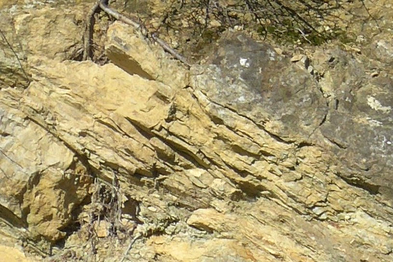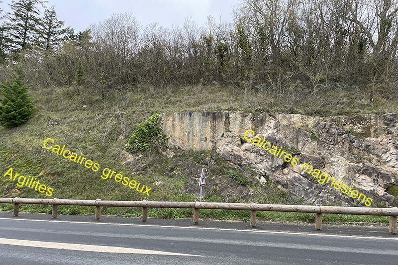 Aux calcaires magnésiens massifs succèdent des calcaires finement lités, offrant moins de résistance à l’érosion et envahis par la végétation du talus. Ici, le contact entre les deux faciès carbonatés s’effectue par l’intermédiaire d’une petite faille inverse d’un rejet de 0,50 mètres.