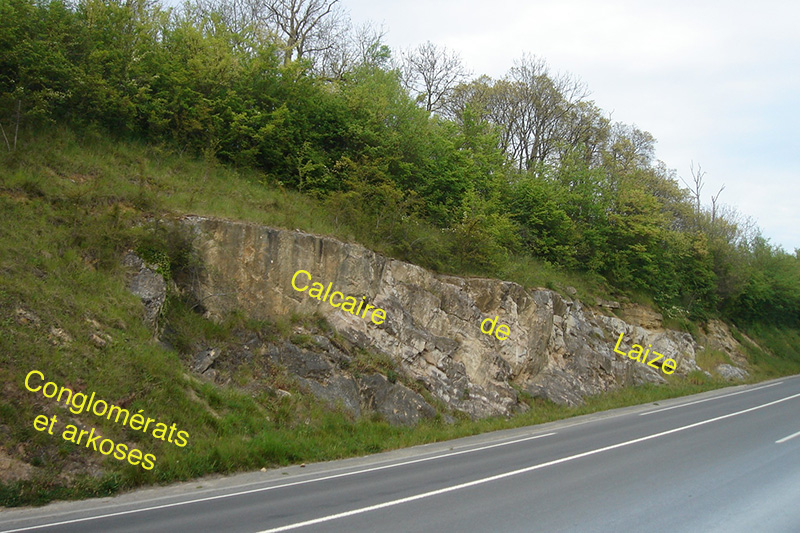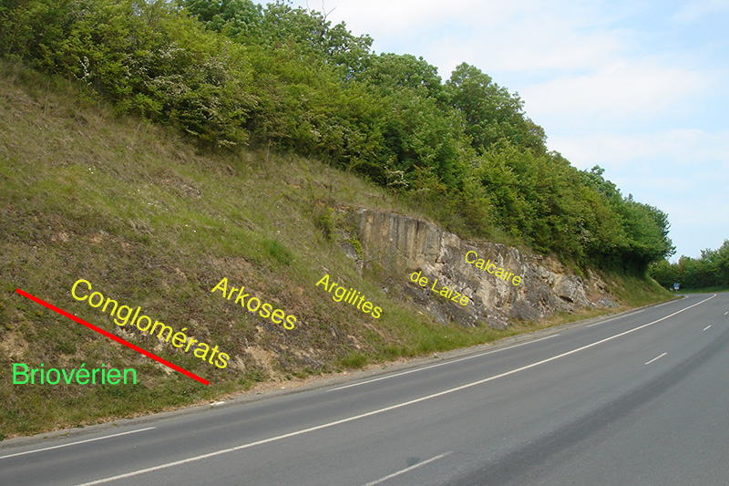 En remontant la route D 562, on peut observer la succession des terrains cambriens. A la base de la série, les poudingues, les arkoses et les argilites appartiennent à la Formation des Poudingues et arkoses (k1) qui constituent la base sédimentaire du Cambrien dans les synclinaux paléozoïques normands. Le Calcaire de Laize appartient à la Formation des Schistes et calcaires (k2). Vue prise en 2011