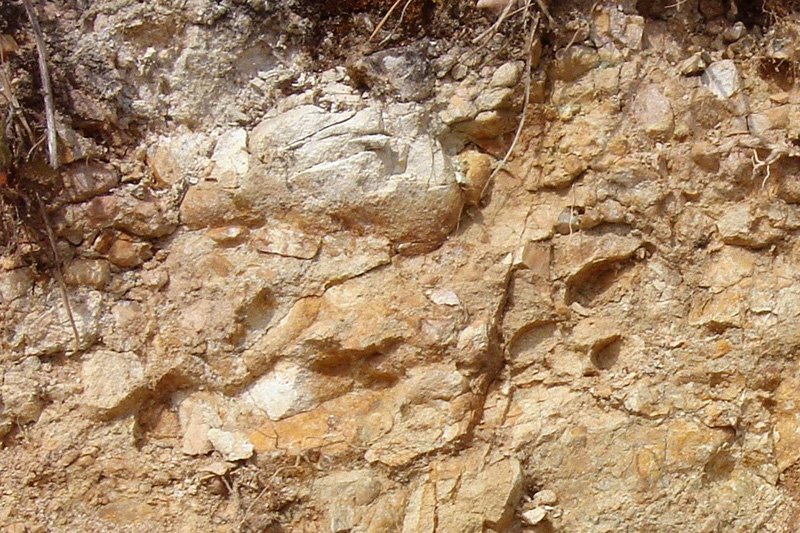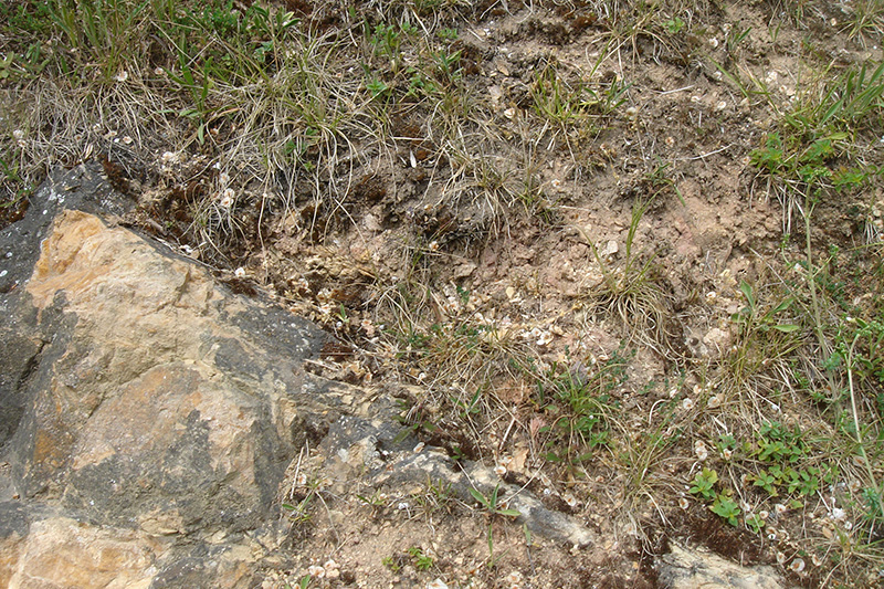 Les argilites disparaissent sous le couvert végétal. Elles sont rouges ou violacées à passées jaunâtres ; elles indiquent une énergie de dépôt faible et un milieu oxydant, peu profond. Des passées vertes indiquent un milieu réducteur moins oxygéné. |