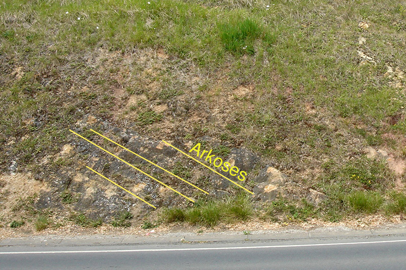 Les conglomérats sont surmontés par des bancs d’arkose présentant le même pendage (30°N). Les arkoses, grès riches en feldspaths, témoignent d'une sédimentation détritique continentale moins grossière. Les conglomérats et les arkoses cambriennes correspondent à de grands épandages fluviatiles au pied de la chaîne cadomienne en cours de démantèlement.