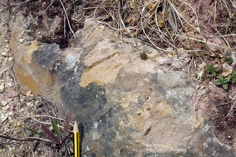 Vue rapprochée d’un banc d’arkose, à patine jaunâtre et à grains clairs de feldspath |