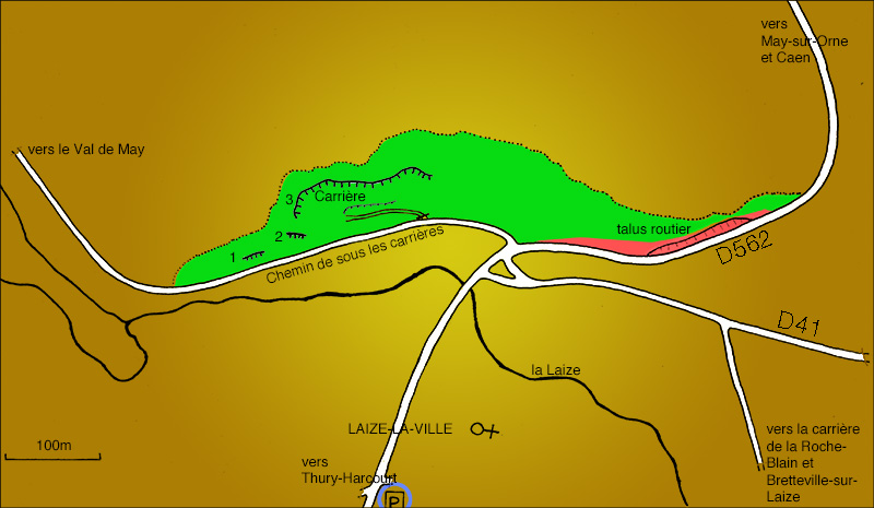 Les affleurements de la coupe géologique sont situés à l’intérieur d’un grand virage de la route D 562. Le panneau d’entrée dans la commune de Laize-la-Ville est placé à la fin de la coupe sécurisée, au niveau de la faille inverse. L’escarpement est situé dans la commune de May-sur-Orne, le long de la limite de la commune de Laize-la-Ville. |