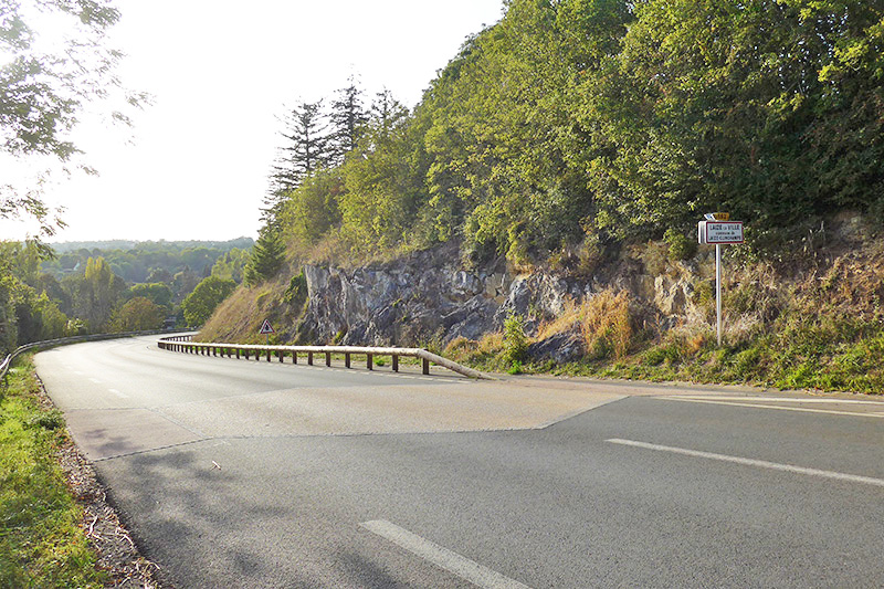 Le Briovérien affleure dans le talus une dizaine de mètres avant le panneau routier. |