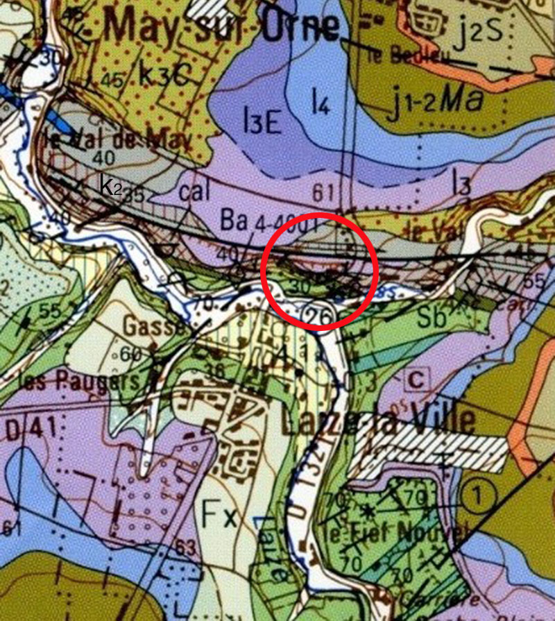 La coupe de Laize est localisée dans le grand virage de la route D562A, entre Laize-la-Ville et May-sur-Orne. Elle englobe les terrains du Briovérien (Sb) affleurant dans la vallée de la Laize et le Cambrien (k1-2-3) du flanc sud du Synclinal de May. Ce dernier est recouvert au nord par le Lias (l3, l4) subhorizontal du plateau qui appartient à la bordure occidentale du Bassin de Paris. |