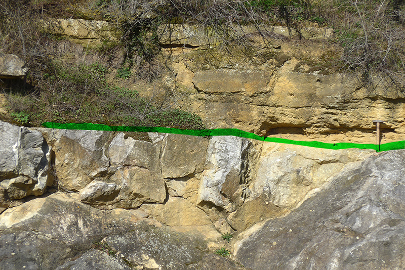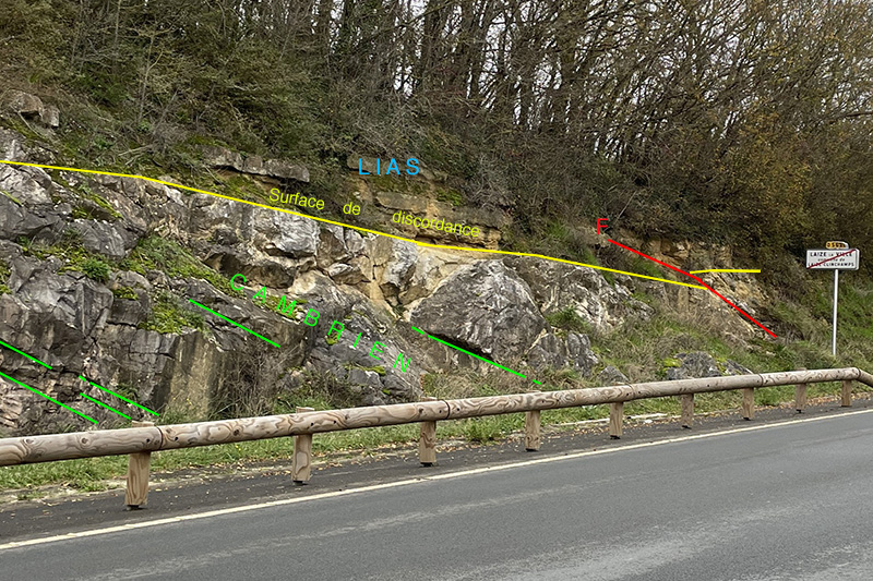 La surface de discordance constitue une limite nette entre le Lias horizontal jaunâtre et le Cambrien plissé gris clair. Elle correspond à une surface d’érosion, postérieure au cycle varisque.