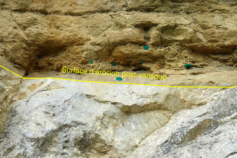 La surface d’érosion post-varisque est soulignée par un conglomérat de la base du Pliensbachien (Lias).