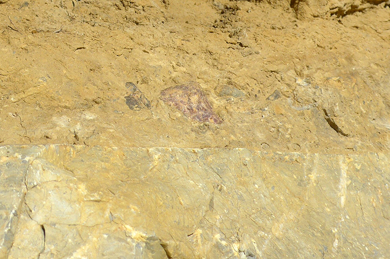 Des galets de calcaire cambrien légèrement rose sont noyés dans la matrice silteuse du conglomérat. |