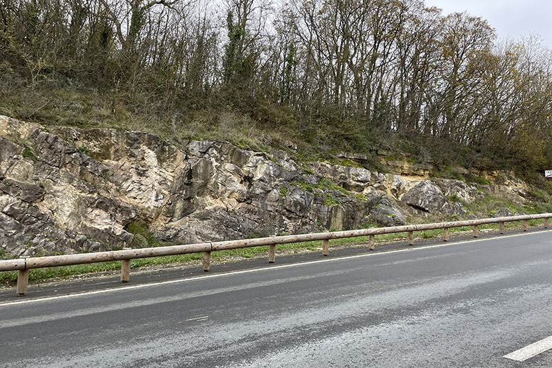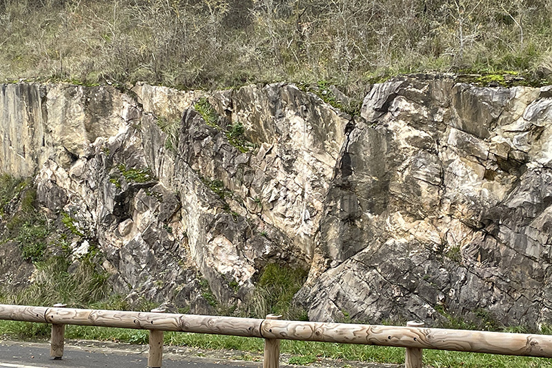 Les calcaires magnésiens massifs du Cambrien, plissés lors de l’orogenèse varisque, plongent vers le nord. Au-dessus, les calcaires jaunâtres du Lias, non plissés, sont subhorizontaux. Il y a discordance angulaire entre ces deux ensembles sédimentaires.