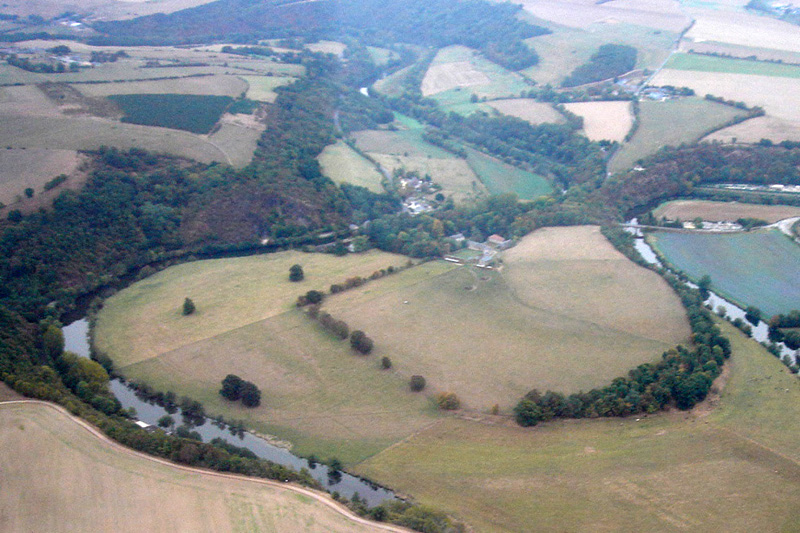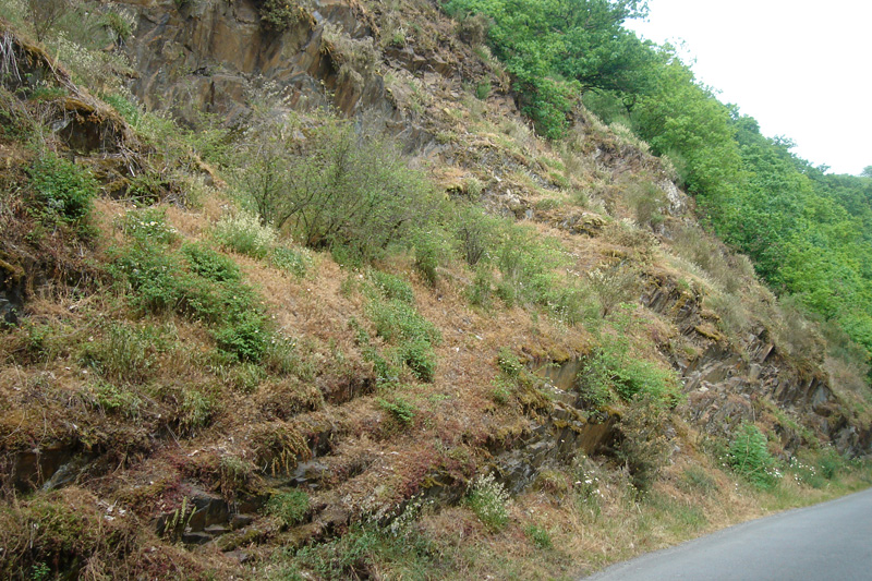 Affleurements de flysch briovérien dans les escarpements rocheux du méandre de l’Orne le long de la route D212a |
