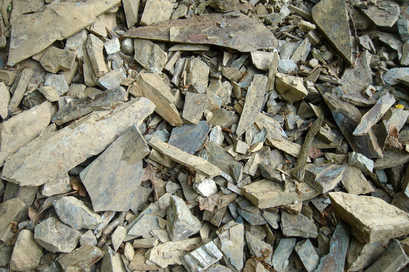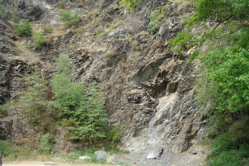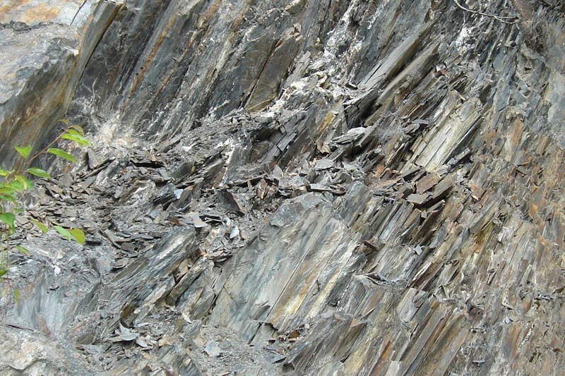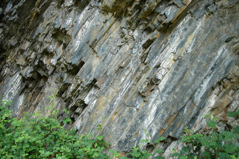 Les siltites du flysch briovérien sont des roches à grain fin ; affectées par la schistosité, elles se débitent en fines plaquettes. |