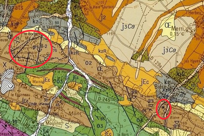A 3 km à l’Ouest du Camp celtique de Bierre, le Grès armoricain est intensément exploité dans la carrière de la Meilleraie, au sud de Vignats.