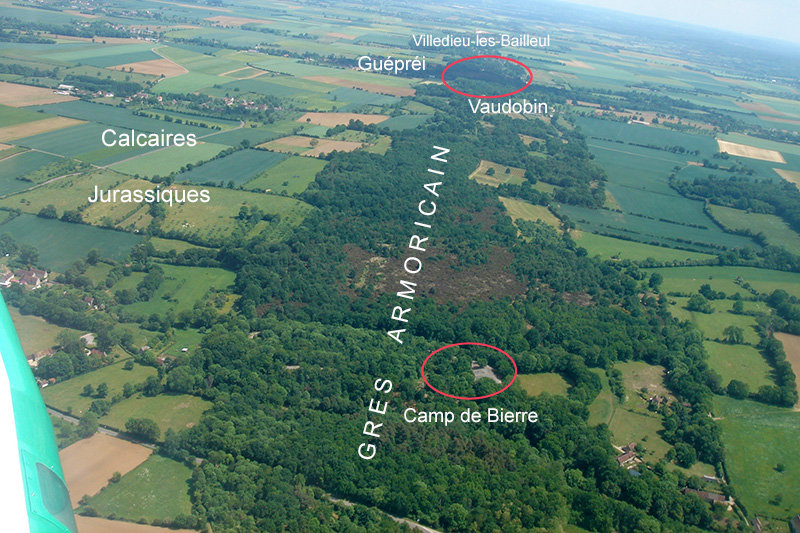 La zone boisée correspond au Grès armoricain (Ordovicien) qui constitue un relief orienté WNW – ESE. Ce relief se poursuit jusqu’à Villedieu-les-Bailleul où il s’ennoie dans les calcaires jurassiques de la bordure du Bassin parisien. Au Nord (à gauche sur la photo), les étendues plates cultivées correspondent aux calcaires jurassiques. Au Sud (à droite sur la photo), les champs et les prairies s’étendent sur les limons qui recouvrent les autres terrains ordoviciens.