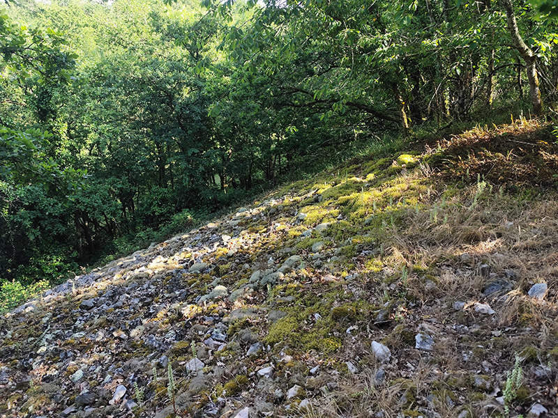 Un pierrier de Grès armoricain prolonge la muraille vers le fond du vallon, dans le versant Est de l’éperon. Ce pierrier présente le même aspect que les pierriers naturels formés lors des périodes froides quaternaires et visibles dans les versants des gorges du Meillon. Sa pente d’environ 30 degrés indique une mise en place par un processus gravitaire. |