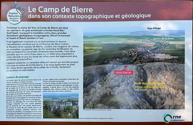 Considéré comme l’un des sites archéologiques de l’âge du Fer les plus importants de l’Ouest de la France, le Camp celtique de Bierre est installé sur un site naturel façonné par la géologie ; les deux cluses qui traversent la barre de Grès armoricain ont isolé un éperon rocheux sur lequel des fortifications ont été construites il y a près de 3000 ans. Cet éperon domine une plaine fertile jusqu'à la vallée de la Dives. |