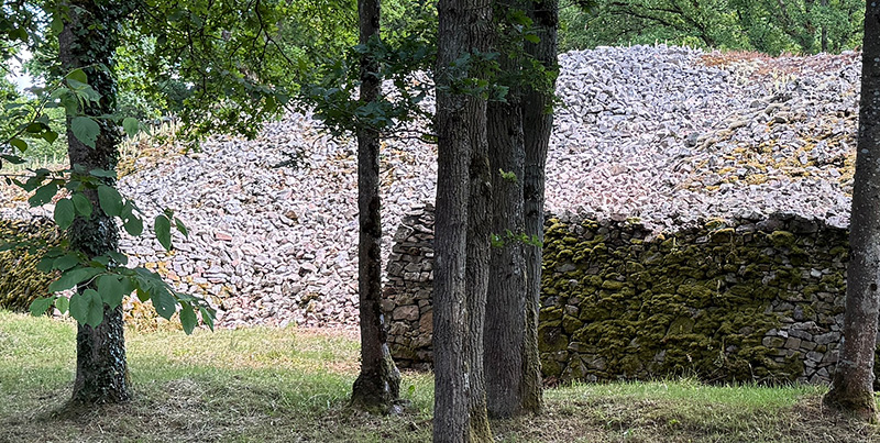 A l’extrémité sud de l’enceinte fortifiée, le mur de parement est dominé par une énorme accumulation de blocs de Grès armoricain installée sur la rupture de pente du sommet de l’éperon, ce qui rend la fortification plus imposante depuis l’extérieur. |