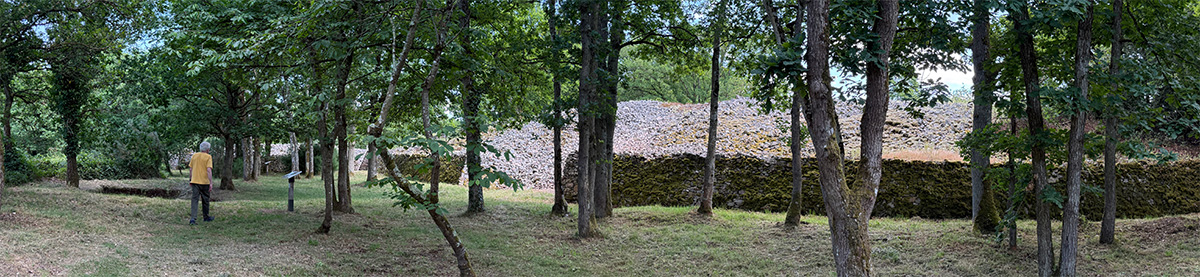 Au sommet de l’éperon rocheux, le chemin d’accès franchit un talus de pierres. Cet amoncellement de blocs de Grès armoricain correspond à la muraille effondrée de l’enceinte fortifiée construite à l’âge du Fer.