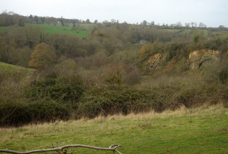 On aperçoit la carrière taillée dans le Briovérien (Flysch de la Laize) du coteau boisé, en rive droite de la Laize ; en arrière-plan, le Briovérien de la rive gauche offre un paysage de vastes prairies entourées de haies discontinues.