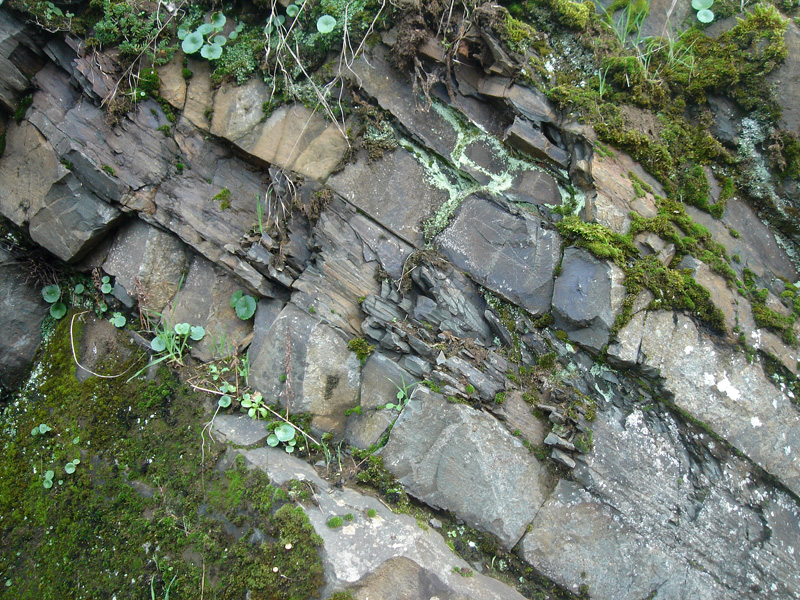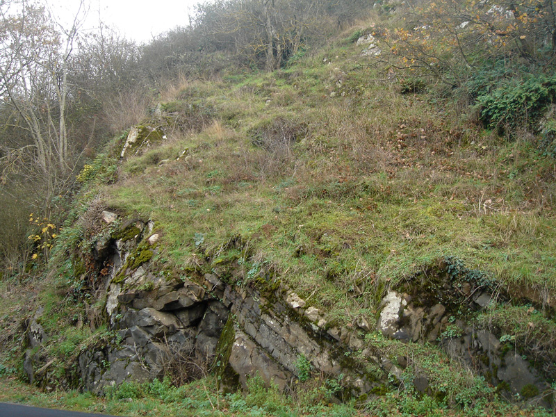 Au niveau de la discordance cadomienne, les conditions d’affleurement ne sont pas favorables à l’observation de cette formation ; par contre, 250 m plus au nord, un affleurement situé en bordure de la route D 532 expose bien le Flysch de la Laize et permet d’observer ses caractéristiques. |